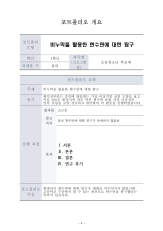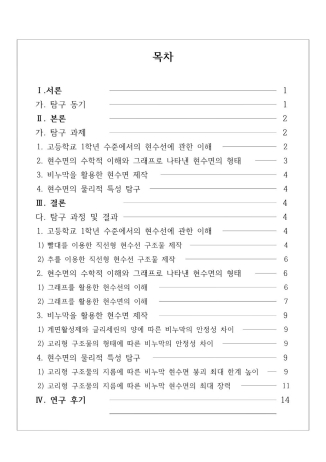 이 탐구보고서는 현수면이라는 것에 대해 탐구한 보고서입니다. 현수선이라는 것은 중력과 장력에 대응하였을 때 만들어지는 가장 이상적인 선의 모양입니다. 저희는 이를 활용하여 면을 만든 현수면이라는 것에 대해 궁금증을 품고 이에대해 탐구하였습니다.