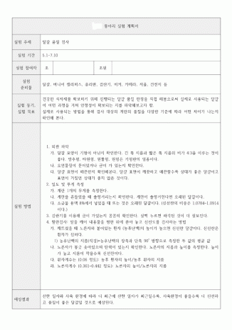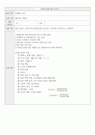 실험보고서는 실험계획서와 실험 결과보고서로 구성되어 있습니다. 실제 우리가 먹는 달걀이 어떤 과정을 거쳐 품질이 평가되고 있는지 확인하고, 닭의 사육환경과 산란일로부터 경과된 시간이 달걀의 품질에 어떤 영향을 미치는지 알아보고자 이 실험을 계획했습니다. 이 활동은 축산물품질평가사 영상과 축산기사 자격증 책을 참고하여 직접 구상한 실험으로, 비슷한 실험에 관한 정보를 찾기 어렵습니다. 따라서 실험 방법과 관련 개념에 대해 정리해 같은 조원들의 이해를 도왔고 이를 바탕으로 진행한 실험의 데이터를 표로 정리해 첨부했습니다. 실험의 데이터 중 측정값이 누락된 부분이 있는데 이는 실험실이 아닌 교실에서 2시간이 채 안 되는 시간 동안 실험을 진행하고 정리까지 하다 보니 문제가 생긴 부분을 재 실험하지 못해 발생한 일입니다. 실험을 이해하고 결론을 내리기에는 무리가 없습니다.