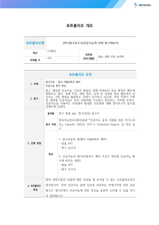 본 포트폴리오는 현재 과학기술의 흐름에 대한 관심을 잘 보여줄 수 있는 포트폴리오라고 생각합니다. 특히 인공지능 관련 진로를 희망하는 학생이라면 위와 같은 탐구로 생기부에서 인공지능에 대한 관심을 충분히 드러낼 수 있을 것이라 생각합니다.