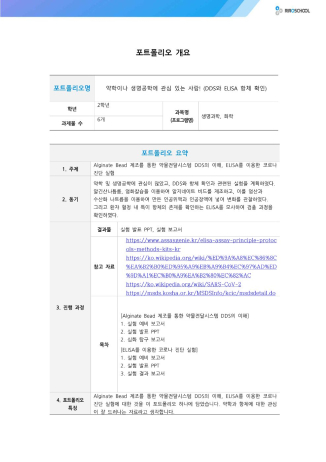 Alginate Bead 제조를 통한 약물전달시스템 DDS의 이해, ELISA를 이용한 코로나 진단 실험에 대한 것을 이 포트폴리오 하나에 담았습니다.