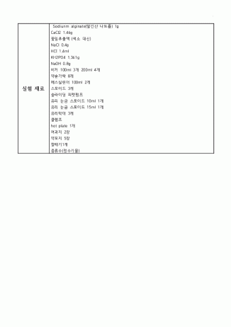 알긴산나틈륨, 염화칼슘을 이용하여 알지네이트 비드를 제조하고, 이를 염산과 수산화 나트륨을 이용하여 만든 인공위액과 인공장액에 넣어 변화를 관찰하였습니다.