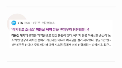 약제 100%로 운영되는 경우가 많습니다. 그러나 과연 편리하다고만 인식되는 예약제가 생산자와 소비자 양쪽에게 모두 이득을 얻는 결과만 야기할까요? 오히려 노쇼 대비용 보증금과 관련한 마찰, 사회적 약자의 정보 소외 문제가 동반됩니다. 이에 이 포트폴리오에서는 예약제가 현대 한국에 도입된 이유를 코로나19의 측면에서 분석하고, 예약제의 단점을 상세히 설명하려 합니다. 마지막으로 생산자와 소비자 모두의 불편을 해소하기 위한 개선점을 제고하며 현대 사회의 예약제 시스템 문제를 완화하려 합니다.