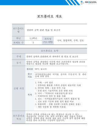 컴퓨터 공학부에 진학하고자 하는 학생들이 참고할 수 있는 포트폴리오입니다. 제가 앱 개발자가 되기를 희망하던 고등학교 1학년 때 여러 과목에서 진행한 발표와 제출한 보고서를 묶어 본 포트폴리오를 구성하였습니다. 국어와 수학, 과학 과목에서 배운 내용과 컴퓨터 공학을 접목한 발표 자료와 정보 보안 기술의 법적 발전에 대한 의견을 담은 보고서로 구성되어 있습니다.
