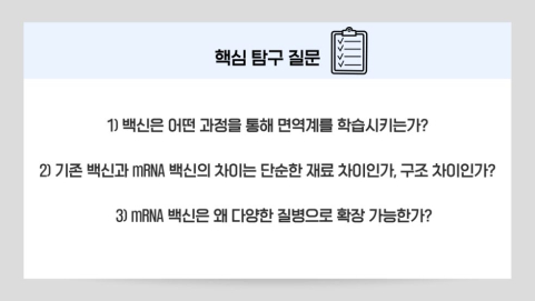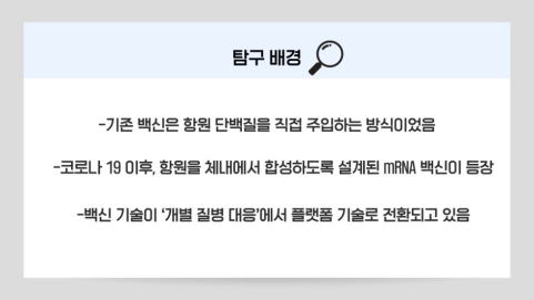 코로나19 이후 mRNA 백신이 짧은 기간 안에 개발·상용화된 사례를 접하며, 기존 백신과는 다른 방식으로 작동하는 백신 기술에 관심을 가지게 되었습니다.