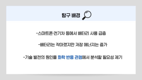 화학Ⅱ에서 배우는 산화·환원 반응과 전자 이동 개념을 실제 배터리 기술에 적용하여 이해해 보고자 본 탐구를 진행하였습니다.