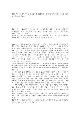 저는 고등학교 2학년 시절부터 새로운 질병에 대해 관심이 생겼는데 그 질병은 바로 알츠하이머입니다. 알츠하이머의 발병 원인은 현재 여러가지 가설로 나와있는데 아직 분명하게 밝혀진 가설은 없습니다. 그래서 저는 현재 가장 유력하게 알츠하이머를 유발하는 가설에 대해 탐구를 진행했고 탐구를 진행하다 보니 알츠하이머를 태아 시절 검사하여 밝혀낼 수 있지 않을까라는 생각이 들어 이런 주제를 탐구하게 되었습니다.
